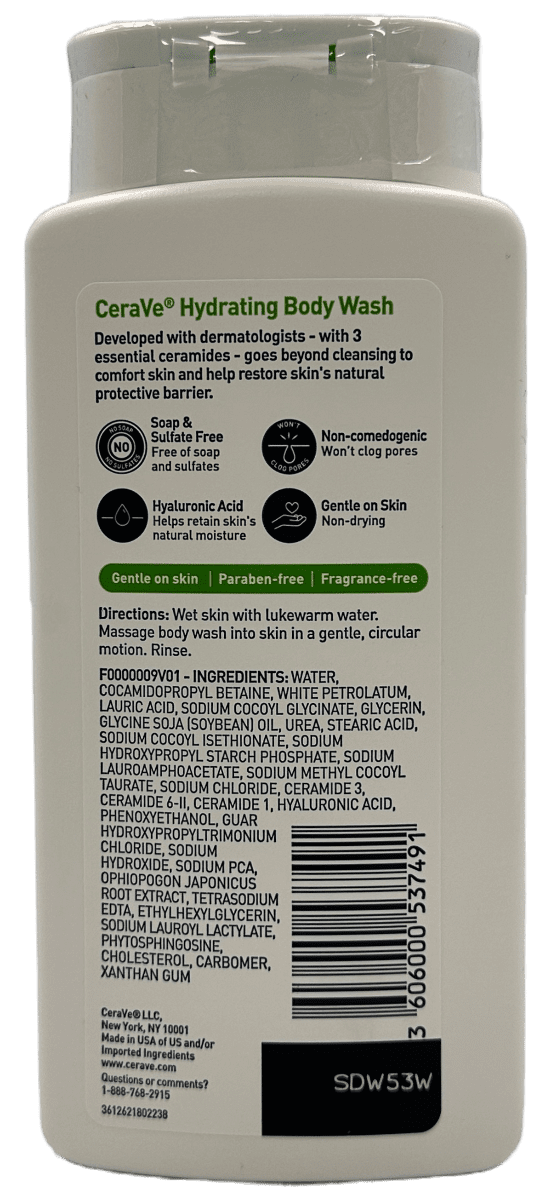 CeraVe Hydrating Body Wash is Developed with dermatologists- with 3 essential ceramides – goes beyond cleansing to comfort skin and helps restore the protective skin barrier.