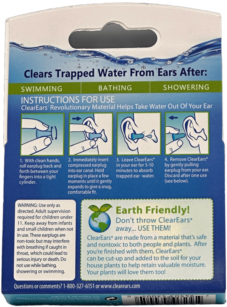 - Leave ClearEars in your ear for 5-10 minutes to absorb trapped ear-water.