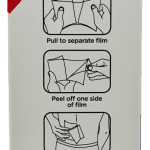 Pull to separate film – Peel off one side of film – Place patch on skin – Peel off other side of film – Press firmly to skin