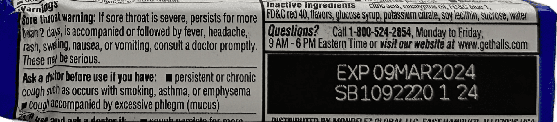 Citric Acid, Eucalyptus Oil, FD&C Blue 1, FD&C red 40, Flavors, Glucose Syrup, Potassium Citrate, Soy Lecithin, Sucrose, Water.