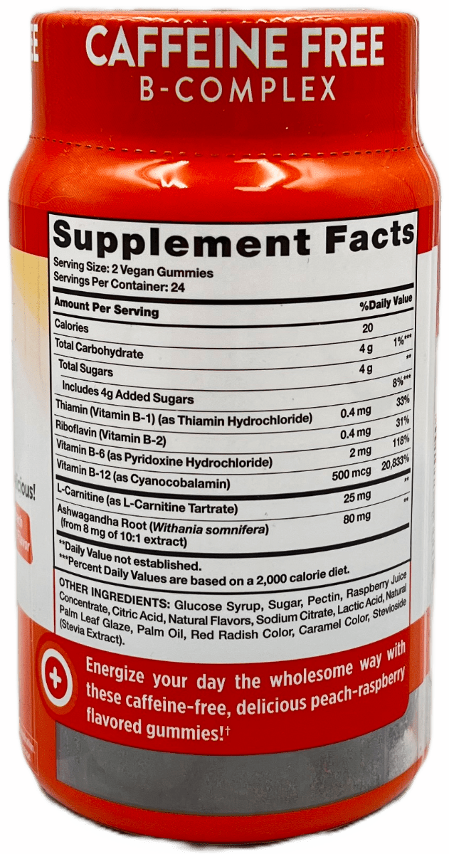 Energize your day the wholesome way with these caffeine-free, delicious peach-raspberry flavored gummies!.